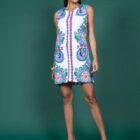Este vestido se destaca por sua estampa localizada e vibrante, apresentando um mix de padrões geométricos e florais ornamentados em tons de azul, roxo, rosa e verde, sobre um fundo branco texturizado que adiciona um toque sofisticado. O design sem mangas e o corte reto e soltinho proporcionam um caimento confortável e jovial, enquanto os bolsos frontais com acabamento estampado trazem funcionalidade e um charme extra.